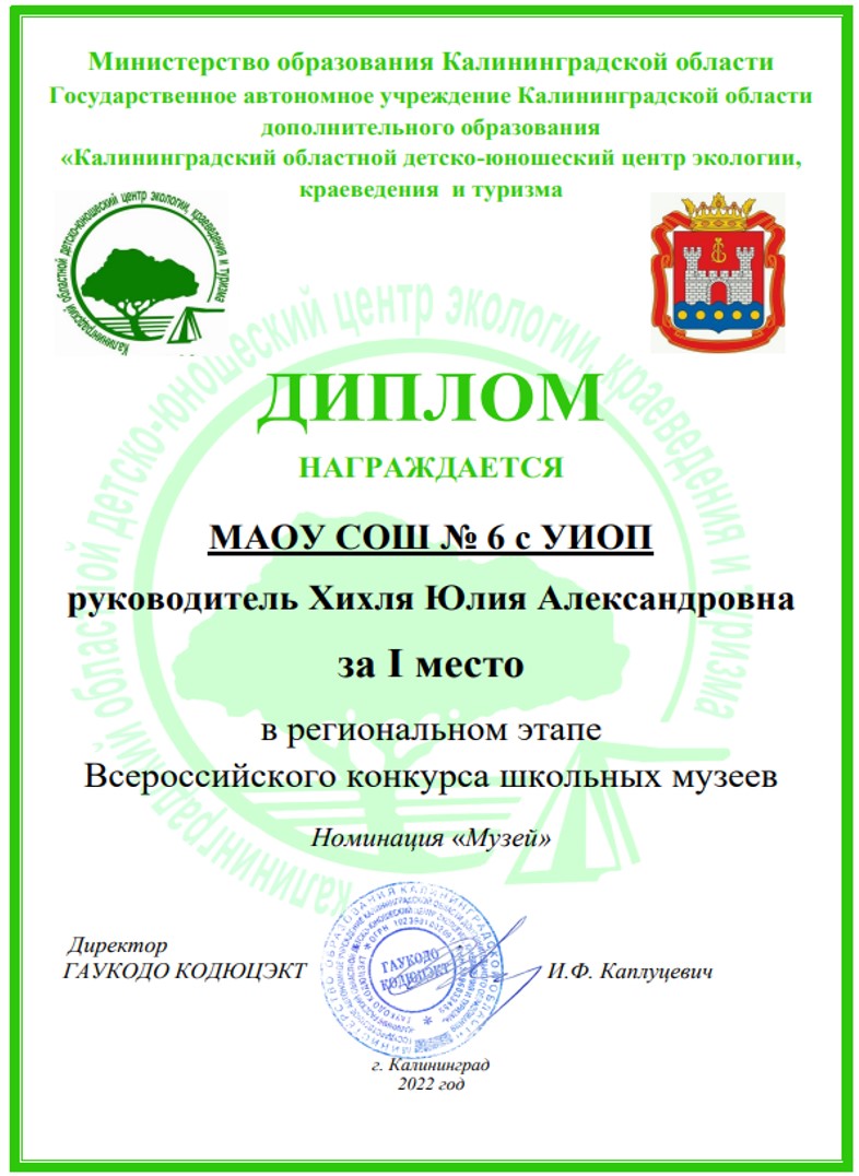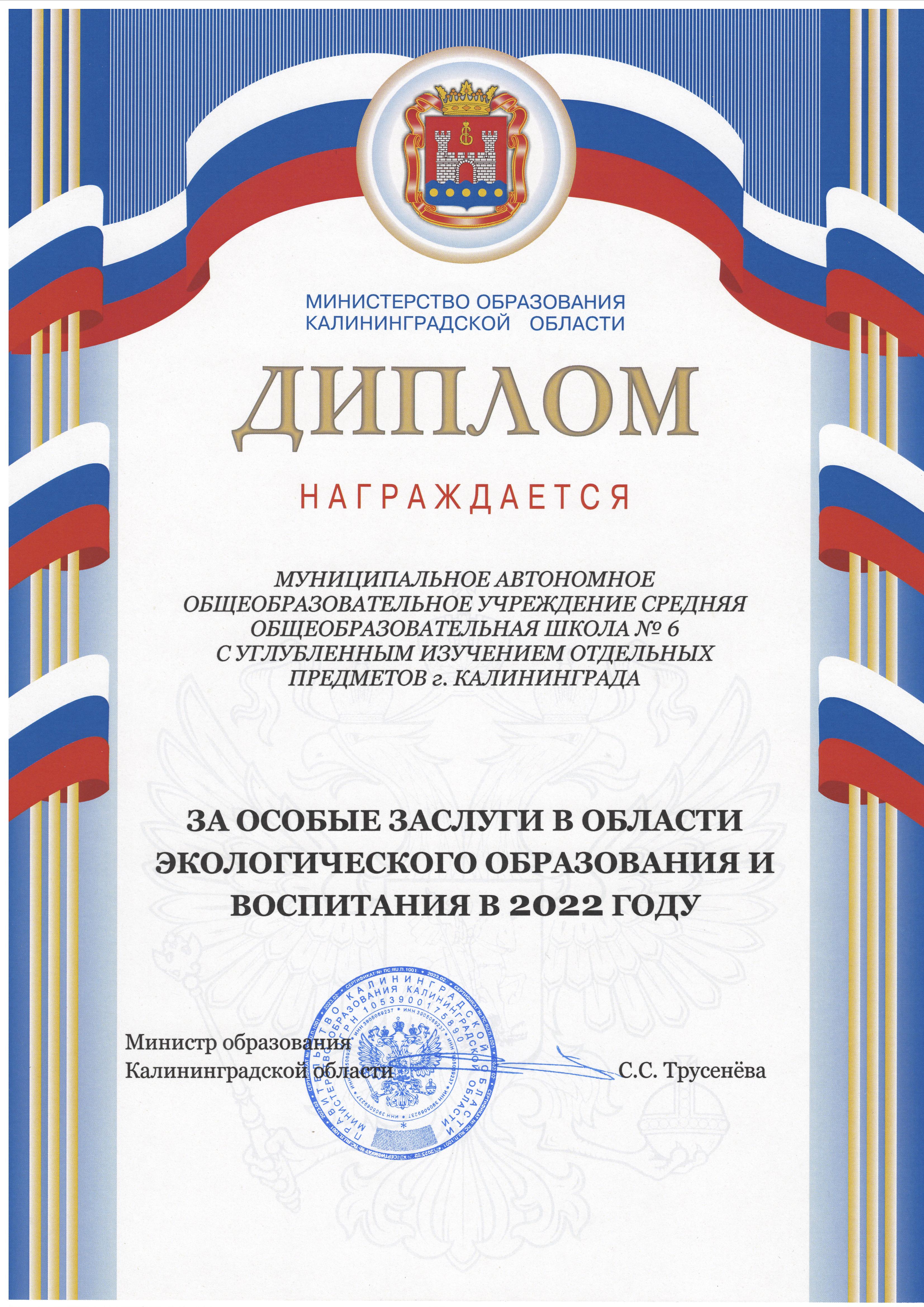 Грамота министерства образования Калининградской области за особые заслуги в области экологического образования и воспитания в 2022 году.