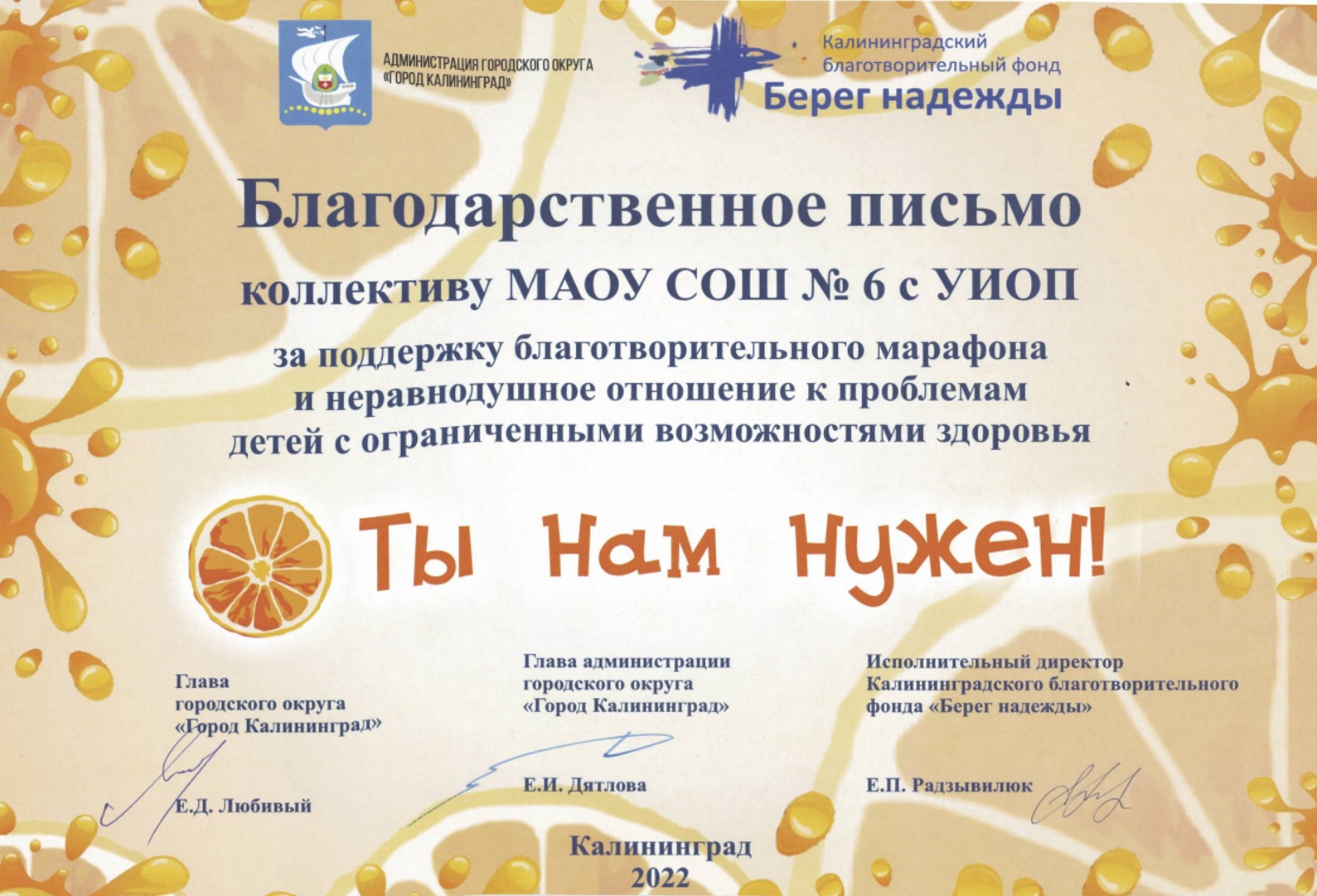 Благодарственное письмо за поддержку благотворительного марафона и неравнодушное отношение к проблемам детей с ограниченными возможностями здоровья.