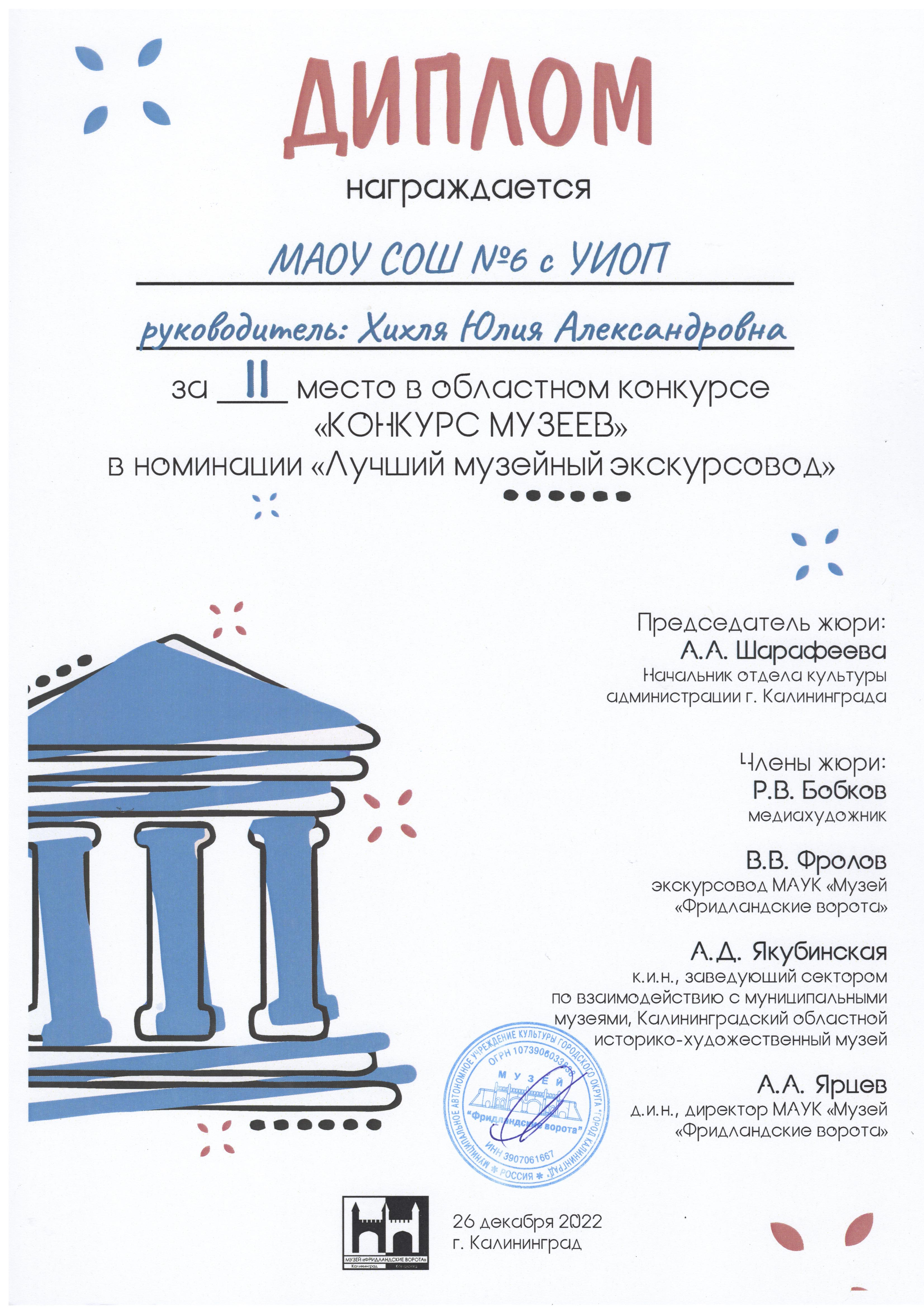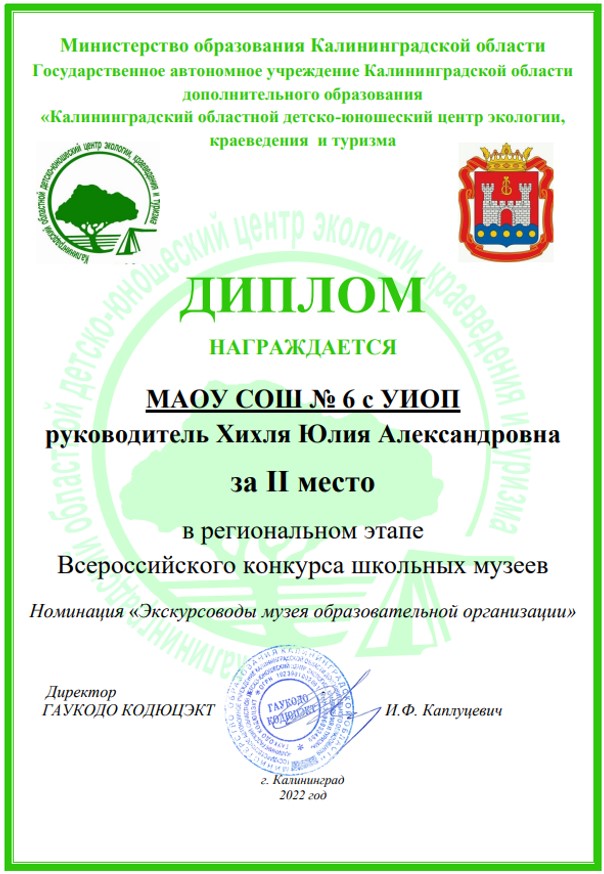 Диплом за 2 место в региональном этапе Всероссийского конкурса школьных музеев в номинации «Экскурсоводы музея образовательной организации».