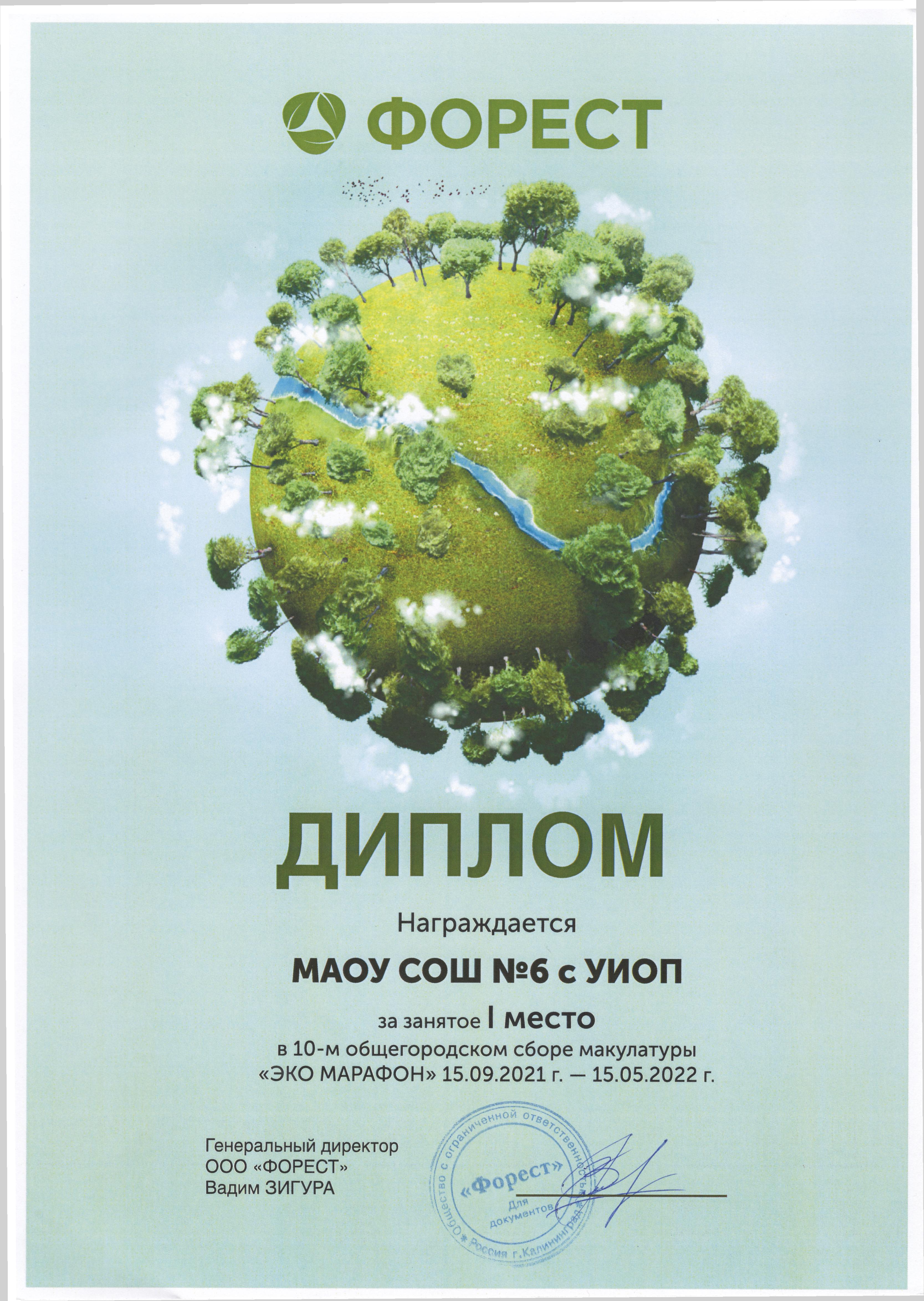 Диплом за 1 место в 10-м общегородском сборе макулатуры «ЭКО МАРАФОН» 2021-2022 г.