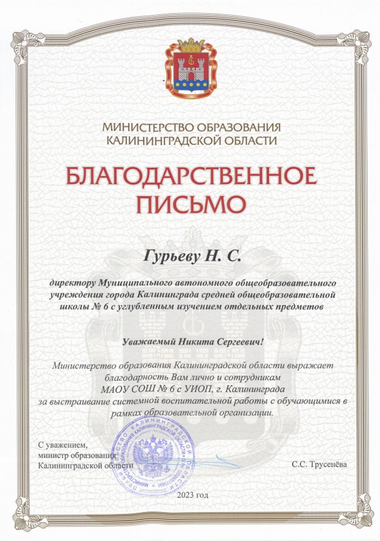 Благодарственное письмо директору и сотрудникам МАОУ СОШ № 6 с УИОП за выстраивание системной воспитательной работы с обучающимися в рамках образовательной организации.